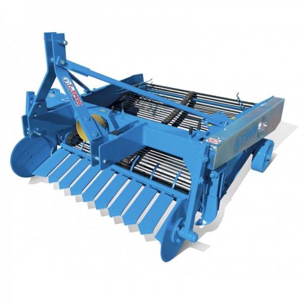 Scavapatate portata a scarico posteriore applicabile sui trattori muniti di attacco a 3 punti e presa di forza (PTO). La macchina viene costruita nelle misure di lavoro di cm 60 monofi la, cm 130 e 150 bifi la. Quattro sono i punti fondamentali che permettono una buona funzionalità in qualsiasi tipo di terreno pianeggiante o collinare: 1. vomero escavatore composto da più lame intercambiabili e 2 dischi tagliaerbe laterali; 2. Kit di protezione e intasamento composto da un pettine a movimento trasversale posto tra il vomero e il nastro trasportatore, il quale agevola l’introduzione del terreno sul nastro trasportatore stesso, e da 2 pulitori mobili i quali impediscono intasamenti tra i dischi tagliaerbe e il nastro trasportatore. 3. Nastro trasportatore composto da astine in acciaio e supportato da rulli in gomma con cuscinetti; 4. Setaccio vibrante posteriore che consente una migliore separazione delle patate dal terreno (optional). Anche in questi modelli di scavapatate come negli altri, tutti i punti soggetti a vibrazioni sono muniti di boccole in gomma antivibranti le quali permettono una migliore stabilità della macchina durante il lavoro.